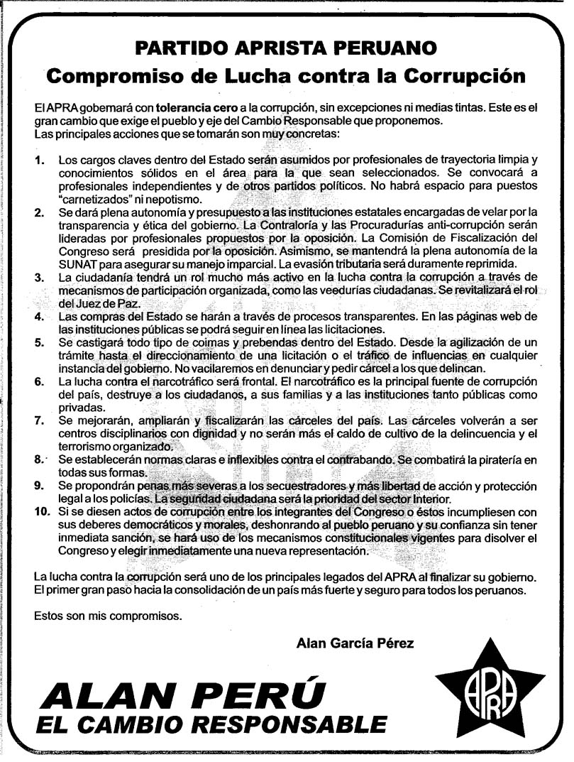 Y claro, aunque ahora suene a papel mojado, hay que recordar que el APRA firmó un Compromiso de Lucha contra la Corrupción, días antes de la segunda vuelta.