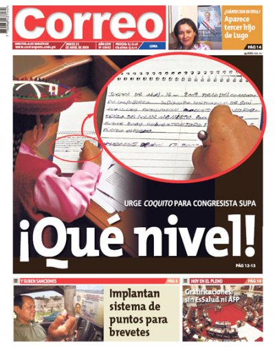 Esta es la portada del diario Correo de hoy. En la misma, tanto como en una nota en su sección política, como en la columna de su director, Aldo Mariátegui, se hace escarnio de las faltas ortográficas de la congresista nacionalista Hilaria Supa, a quien se le tomó una fotografía escribiendo notas en su cuaderno, durante una de las sesiones del Pleno.