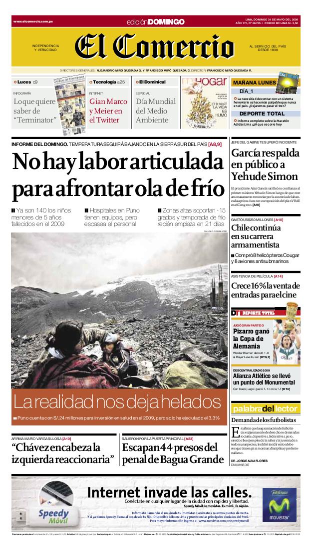 Dramático y real titular de El Comercio de hoy. Luego de un bajo ratio de noticias sobre el tema - ver más en el blog de Elmer Huerta -, los medios de comunicación y los ciudadanos han comenzado a prestar atención a lo que es una tragedia repetida durante casi todos los años en el Perú: Morir de frio.