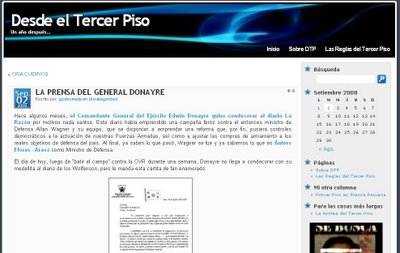 Básicamente es un blog sobre actualidad peruana. Durante sus 4 primeros años se ha concentrado sobre todo en la política de nuestro querido país, sin dejar de tocar temas internacionales, de sociedad y alguna cuota de humor por allí.